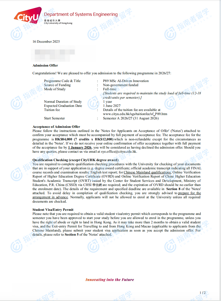 香港城市大學(xué)人工智能驅(qū)動創(chuàng)新理學(xué)碩士研究生offer一枚