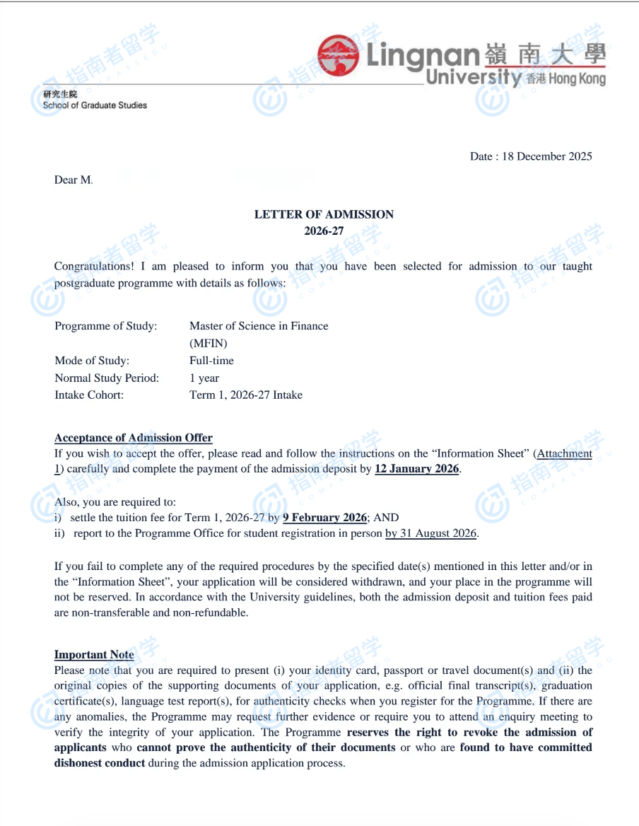 香港嶺南大學金融學理學碩士研究生offer一枚