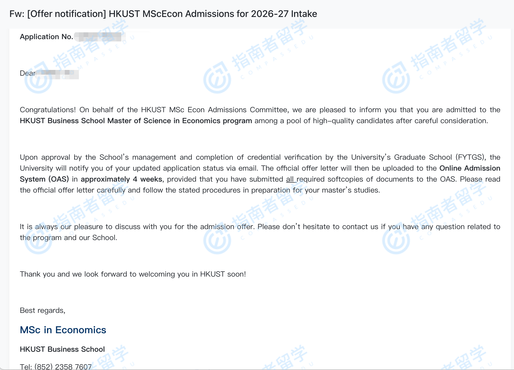香港科技大學(xué)經(jīng)濟(jì)學(xué)理學(xué)碩士研究生offer一枚