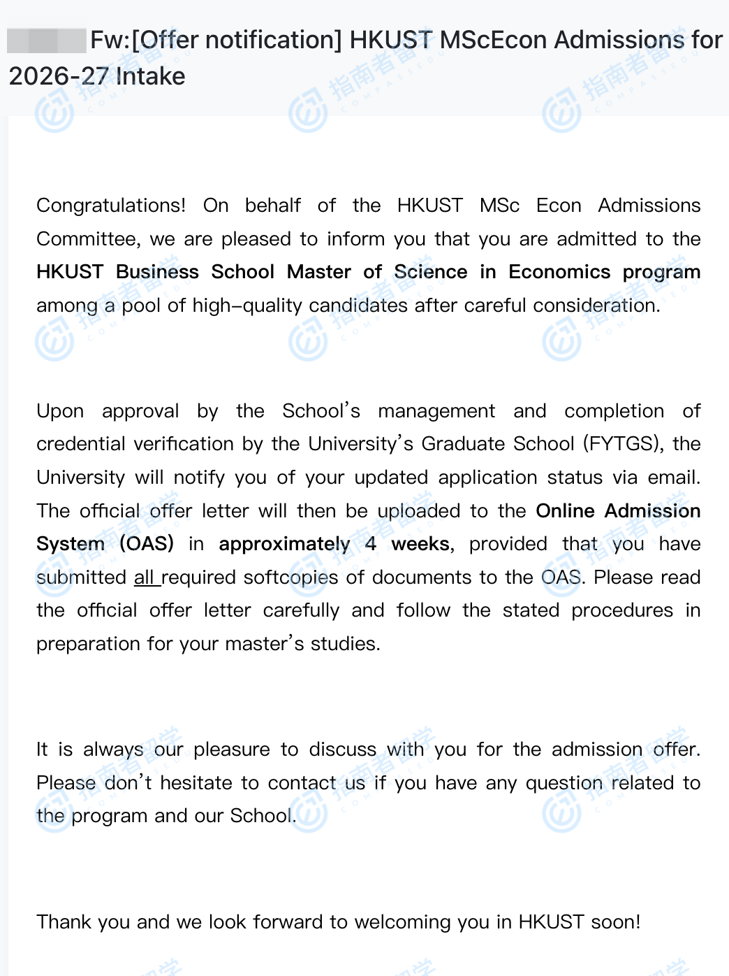 香港科技大學經濟學理學碩士研究生offer一枚