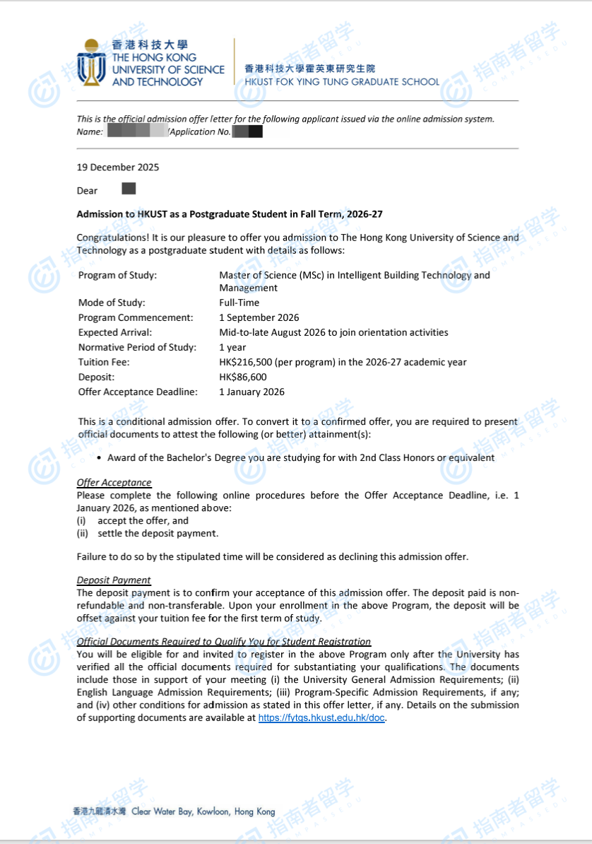 香港科技大學(xué)智能建筑物技術(shù)與管理理學(xué)碩士研究生offer一枚