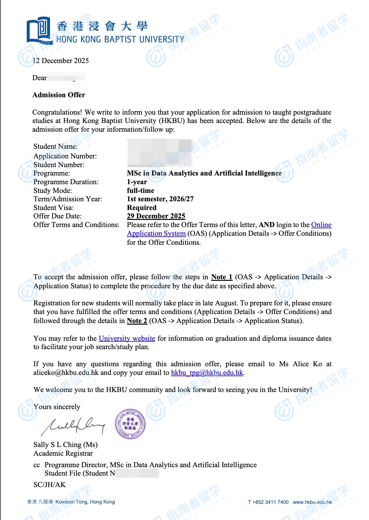 香港浸會(huì)大學(xué)數(shù)據(jù)分析與人工智能理學(xué)碩士研究生offer一枚
