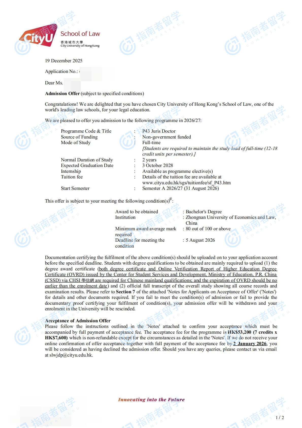 香港中文大學國際經(jīng)濟法法學碩士研究生offer一枚