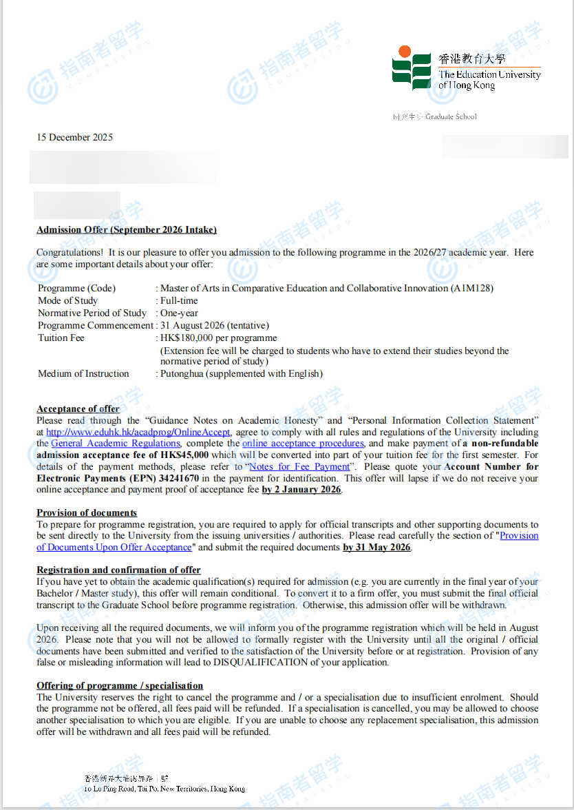 香港教育大學(xué)全球教育研究文學(xué)碩士研究生offer一枚
