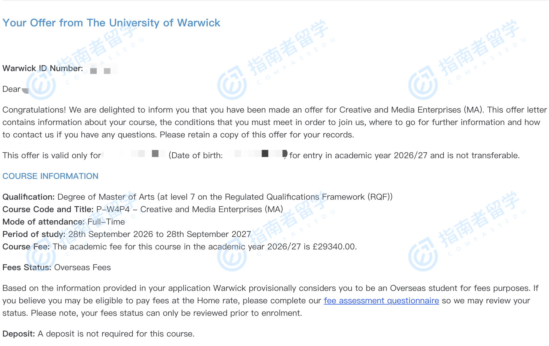華威大學(xué)創(chuàng)意與媒體管理文學(xué)碩士研究生offer一枚
