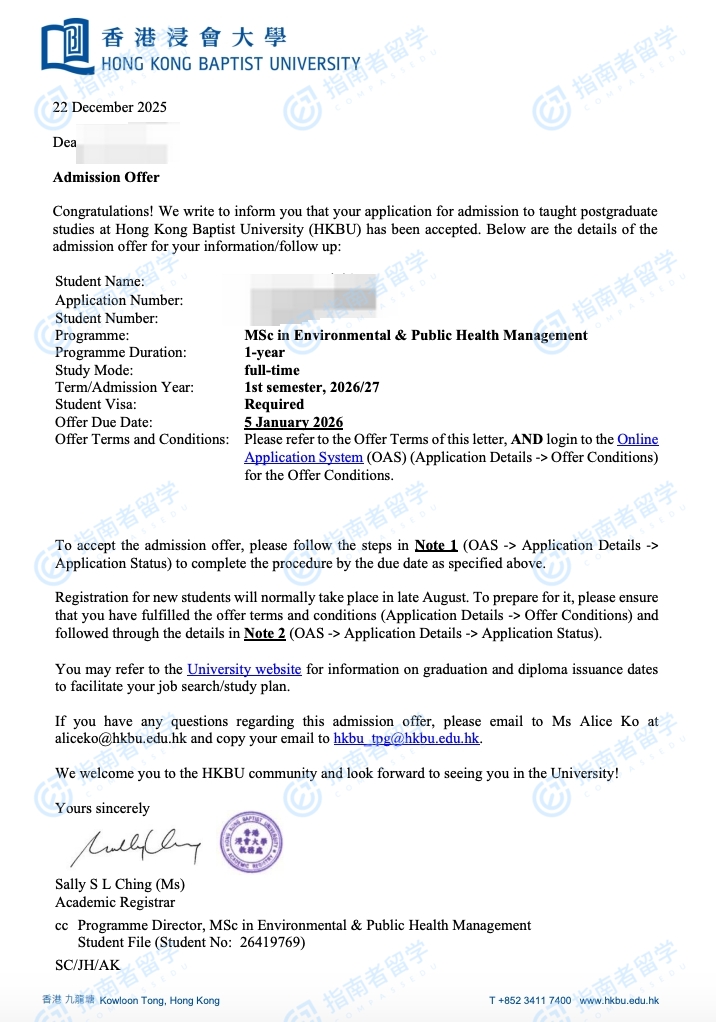香港浸會大學環(huán)境與公共衛(wèi)生管理理學碩士研究生offer一枚