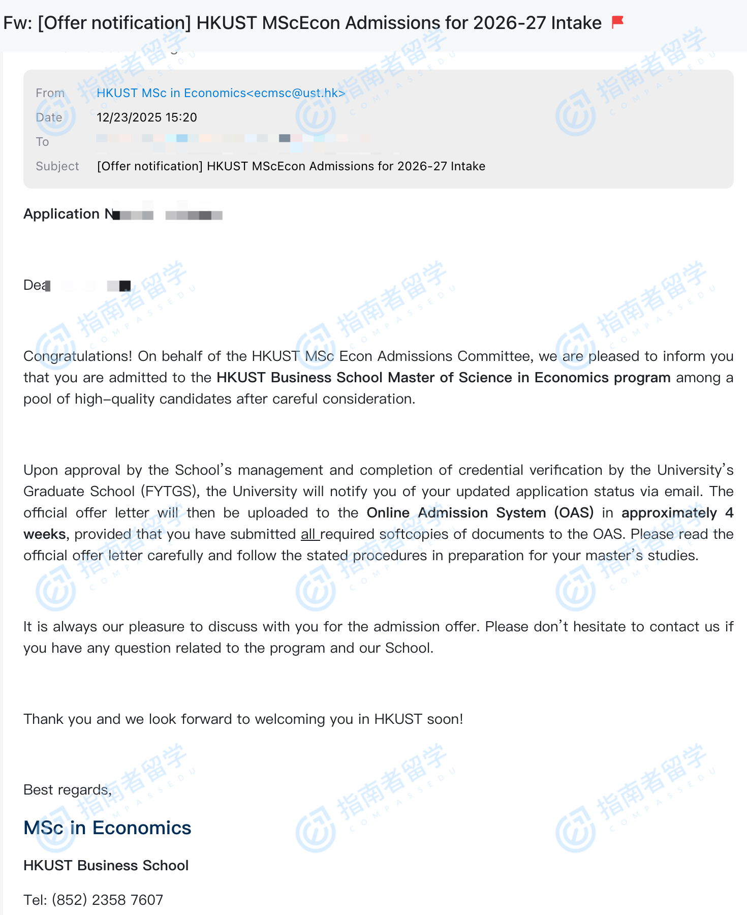 香港科技大學(xué)經(jīng)濟(jì)學(xué)理學(xué)碩士研究生offer一枚