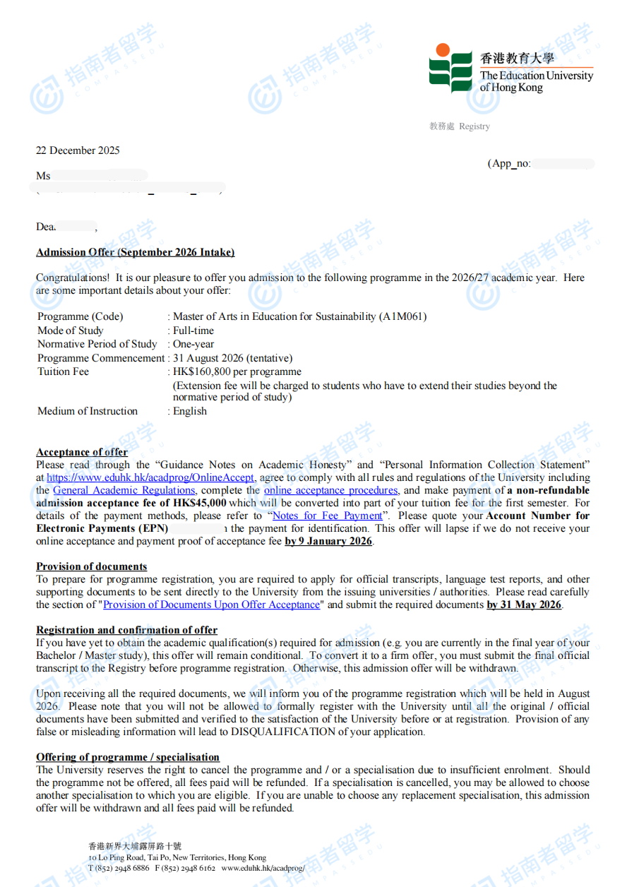 香港教育大學(xué)可持續(xù)發(fā)展教育文學(xué)碩士研究生offer一枚