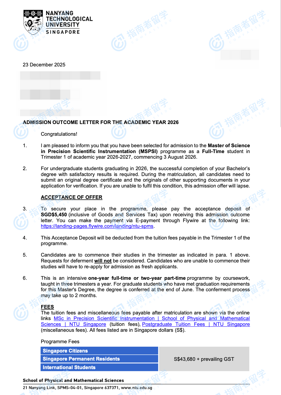 南洋理工大學(xué)精密科學(xué)儀器理學(xué)碩士研究生offer一枚