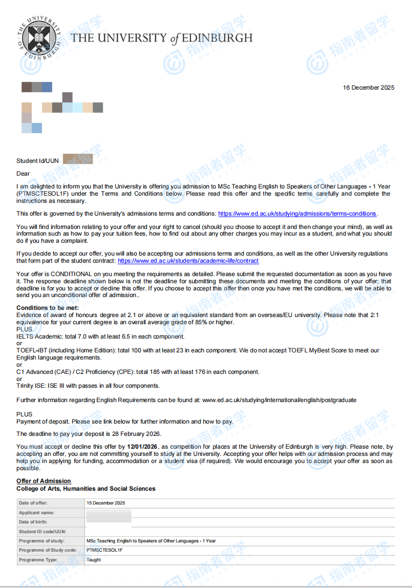 愛丁堡大學對外英語教學理學碩士研究生offer一枚