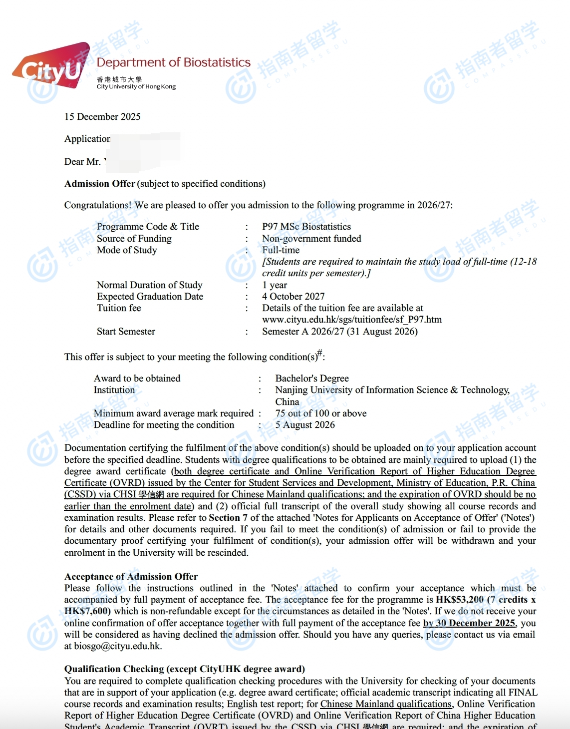 香港城市大學(xué)生物統(tǒng)計(jì)學(xué)理學(xué)碩士研究生offer一枚