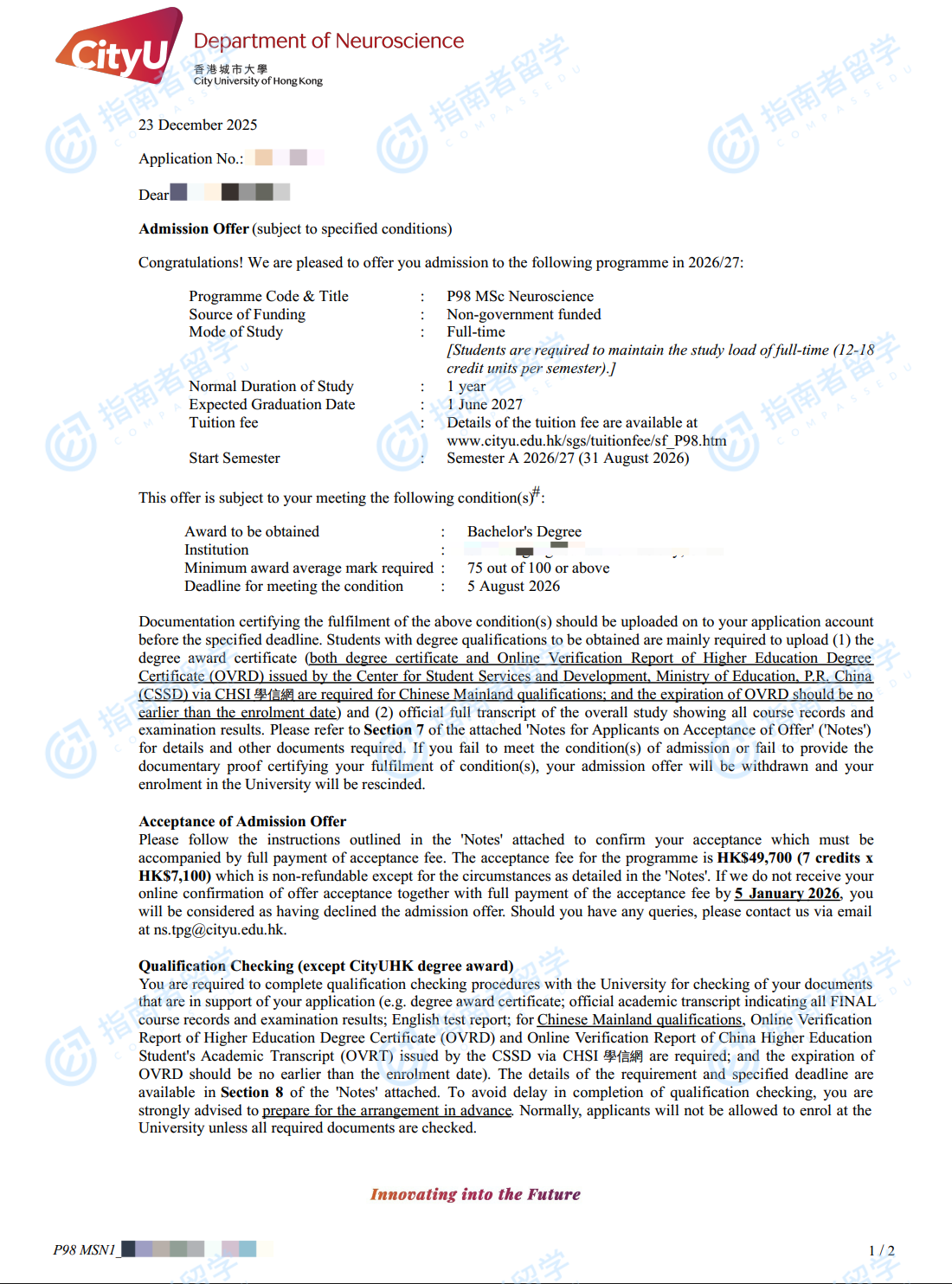 香港城市大學(xué)神經(jīng)科學(xué)理學(xué)碩士研究生offer一枚