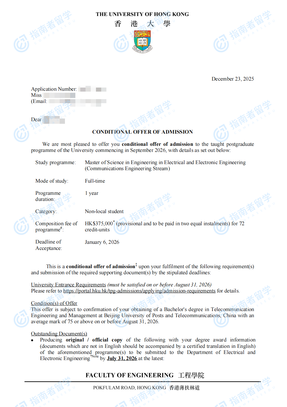香港大學(xué)電氣與電子工程(工程)理學(xué)碩士 - 通信工程方向研究生offer一枚