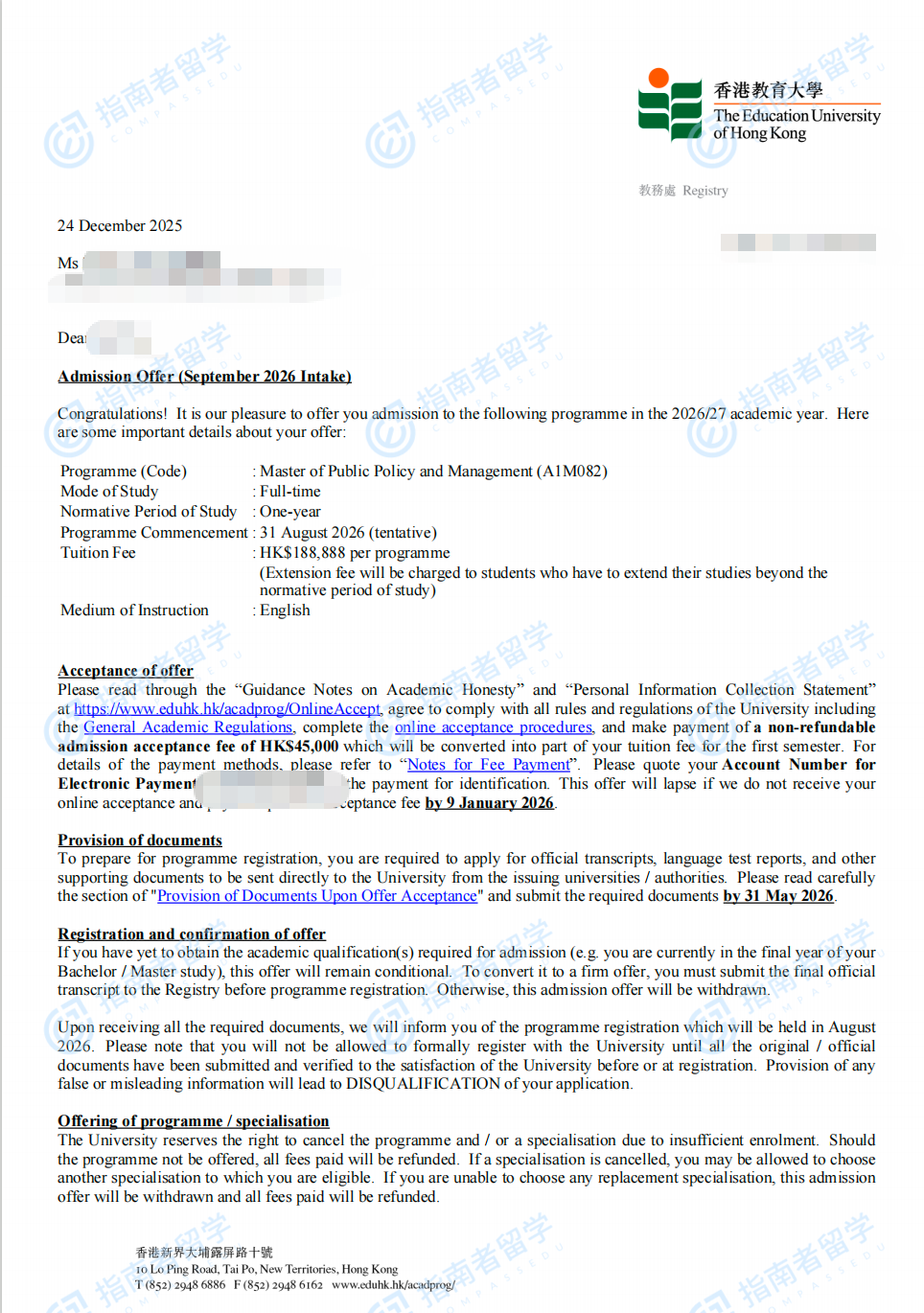 香港教育大學公共政策與管理碩士研究生offer一枚