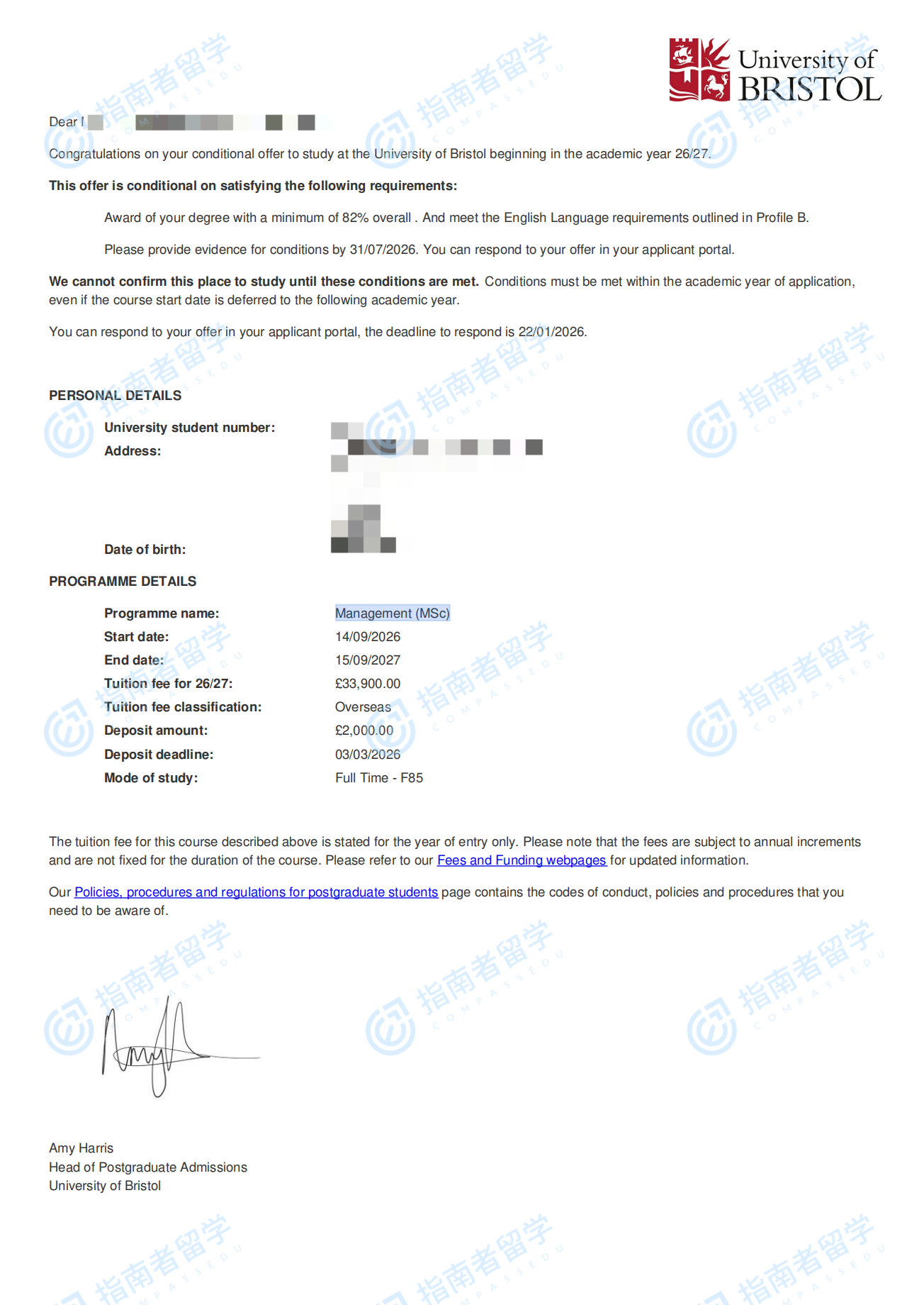 布里斯托大學管理學理學碩士(國際商務(wù))研究生offer一枚