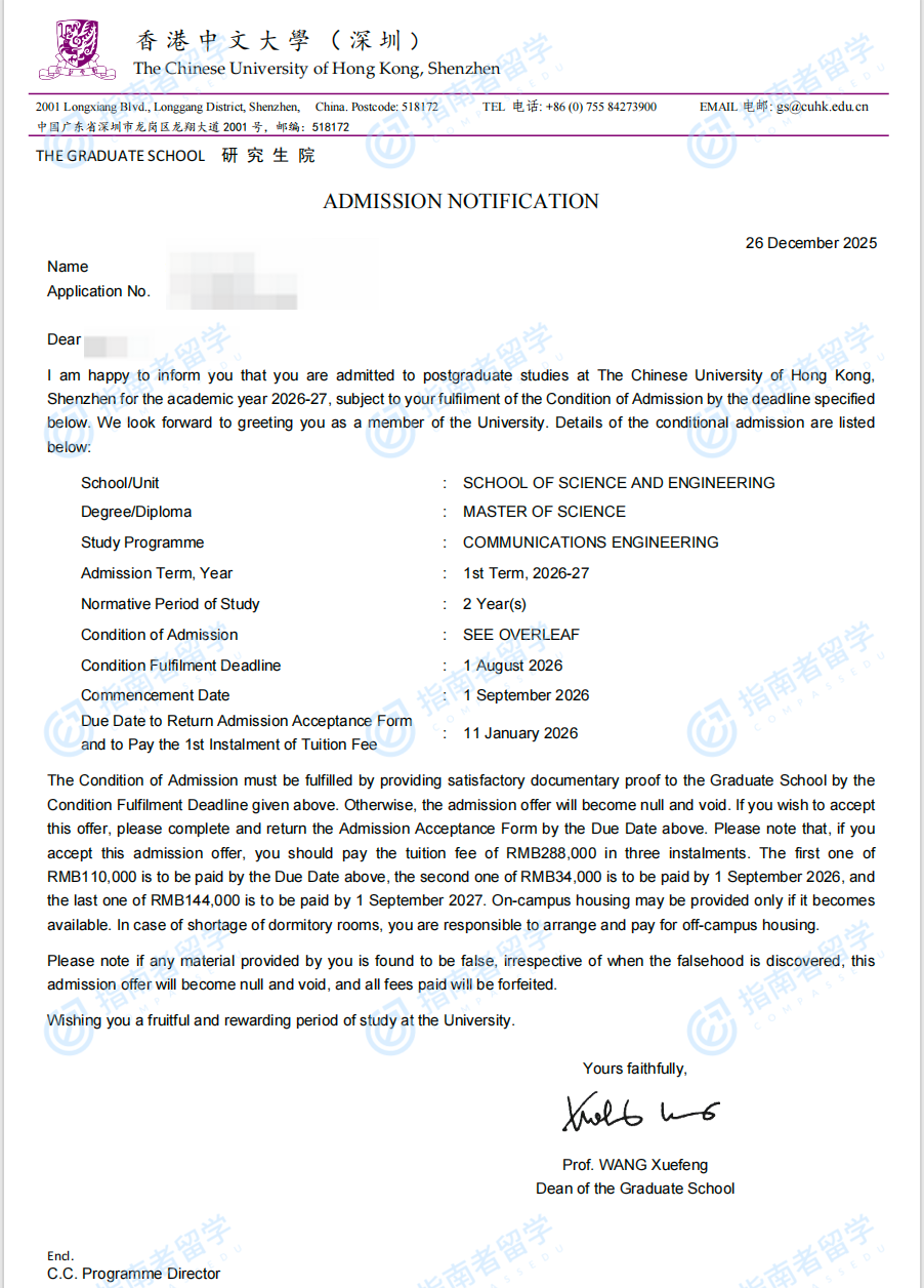 香港中文大學(xué)通信工程理學(xué)碩士(CUHK-Shenzhen)研究生offer一枚