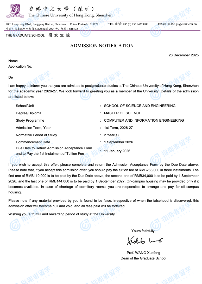 香港中文大學(xué)計算機(jī)與信息工程理學(xué)碩士(CUHK-Shenzhen)研究生offer一枚