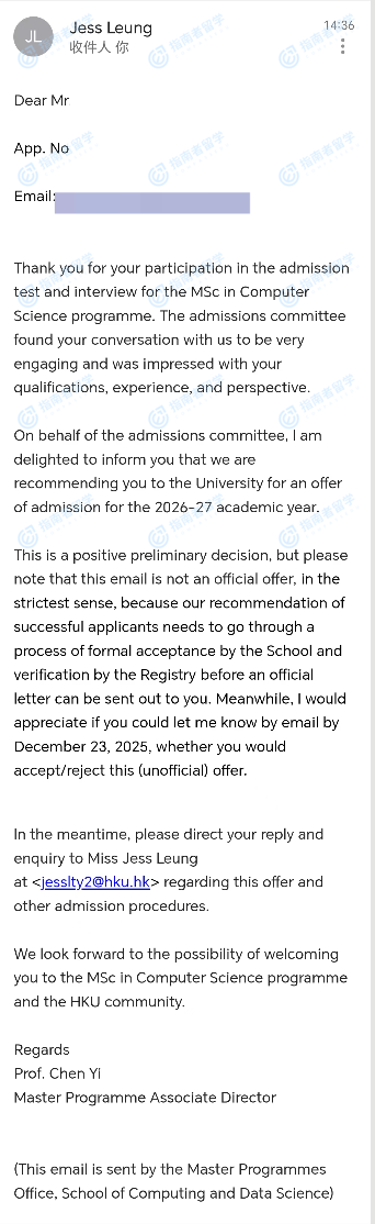 香港大學計算機科學理學碩士(常規(guī)方向)研究生offer一枚