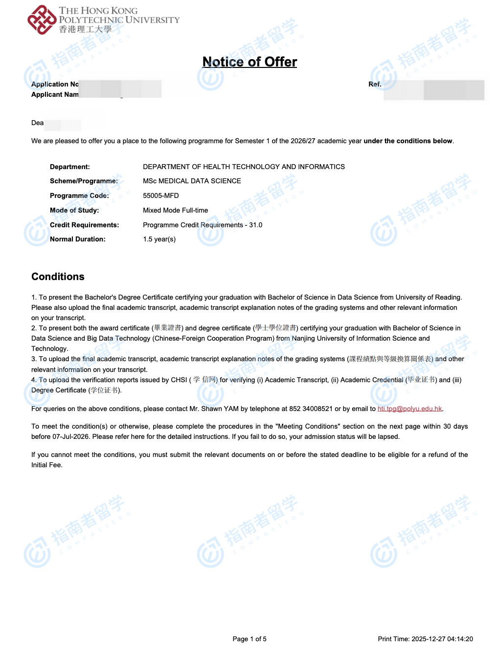 香港理工大學(xué)醫(yī)學(xué)數(shù)據(jù)科學(xué)理學(xué)碩士研究生offer一枚
