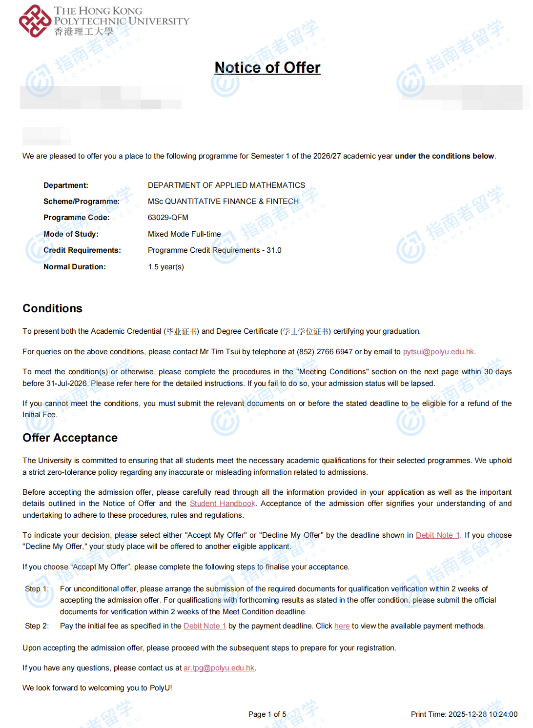 香港理工大學量化金融與金融科技理學碩士研究生offer一枚