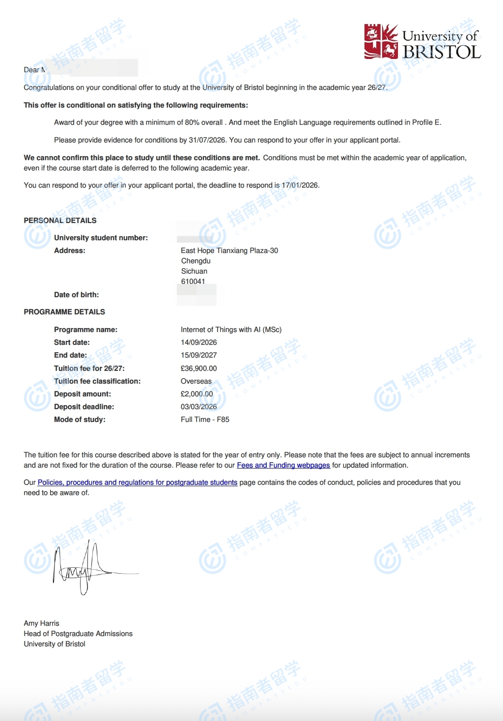 布里斯托大學(xué)物聯(lián)網(wǎng)與人工智能理學(xué)碩士研究生offer一枚
