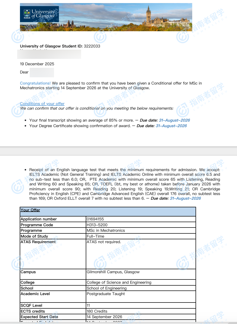 格拉斯哥大學(xué)機(jī)械電子學(xué)理學(xué)碩士研究生offer一枚