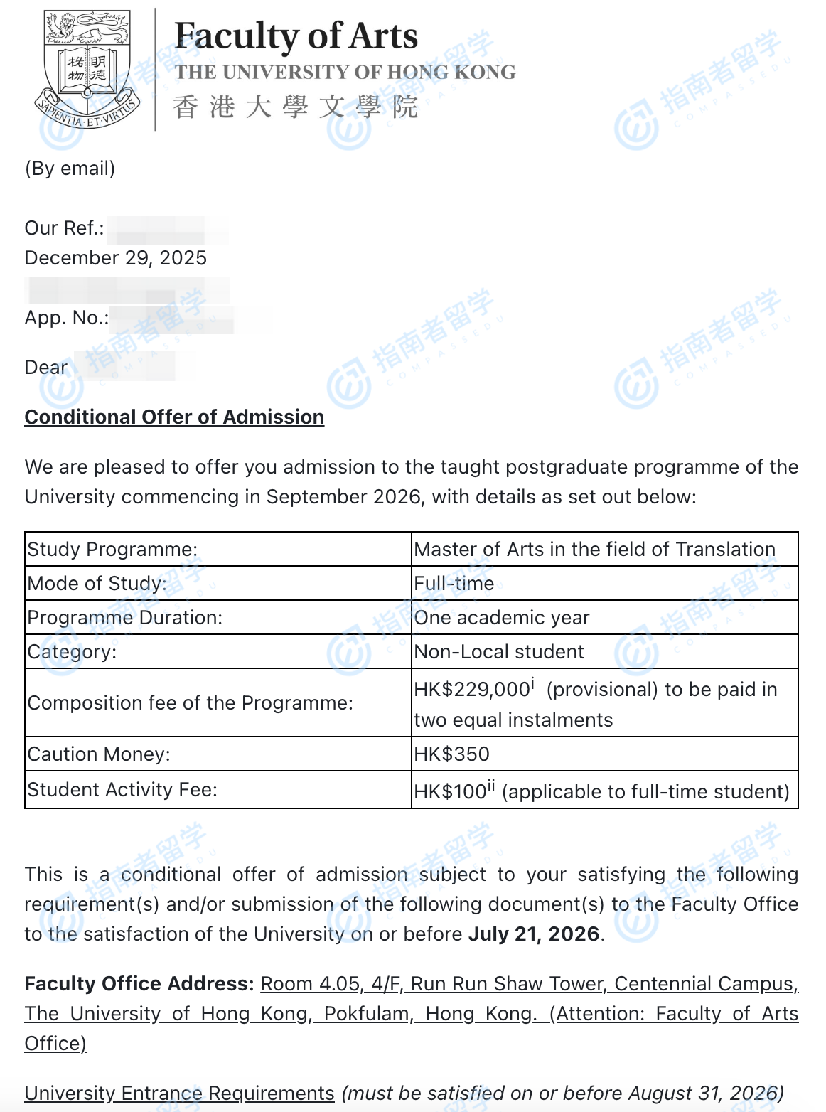 香港大學(xué)翻譯文學(xué)碩士研究生offer一枚
