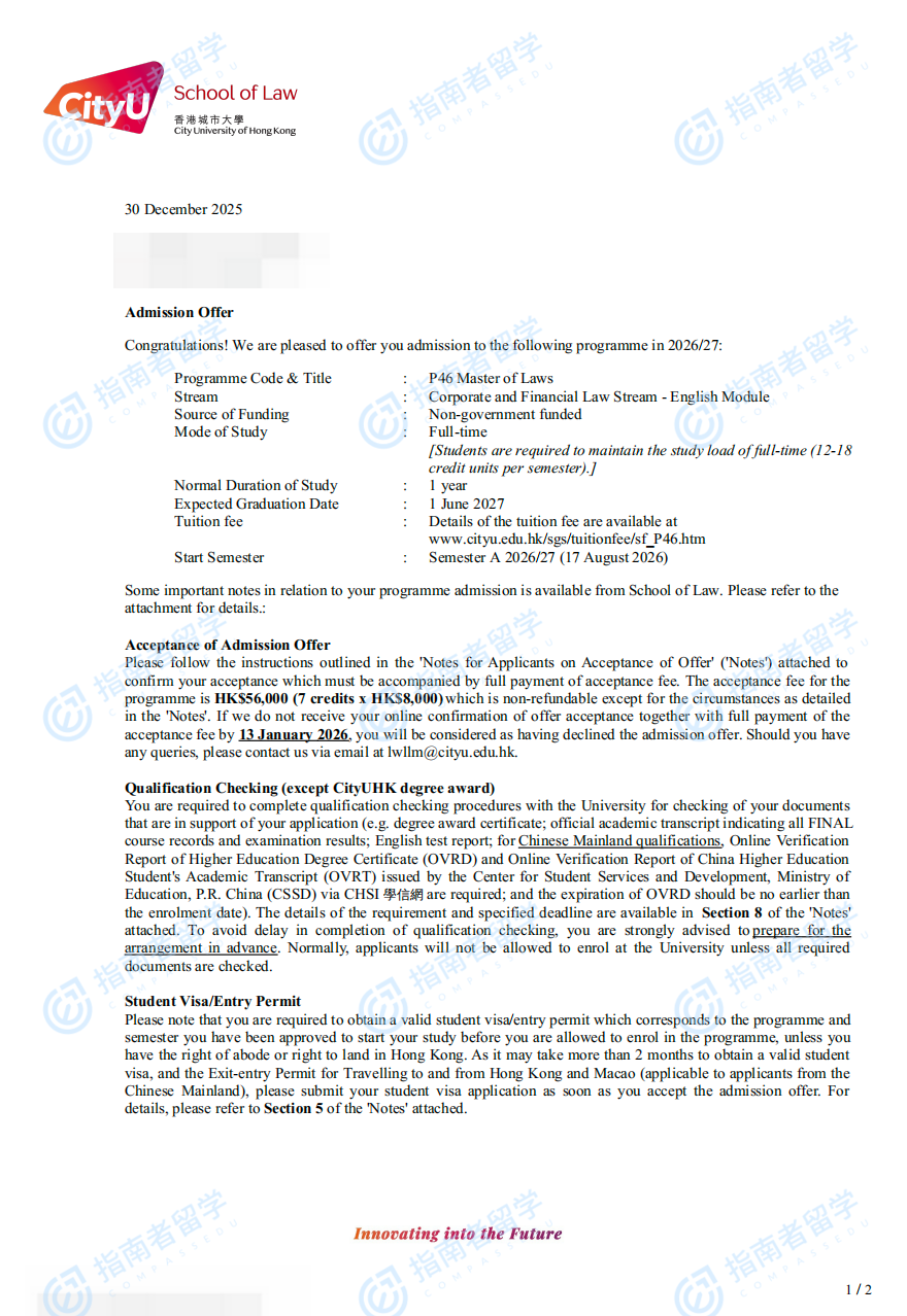 香港城市大學(xué)法學(xué)碩士研究生offer一枚