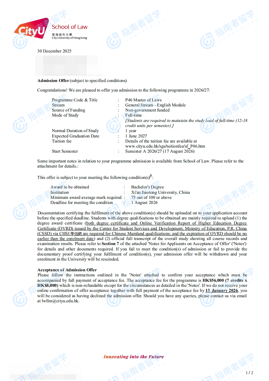 香港城市大學(xué)法學(xué)碩士研究生offer一枚
