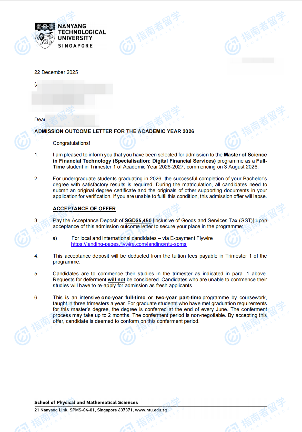 南洋理工大學(xué)金融科技理學(xué)碩士(數(shù)字金融服務(wù))研究生offer一枚