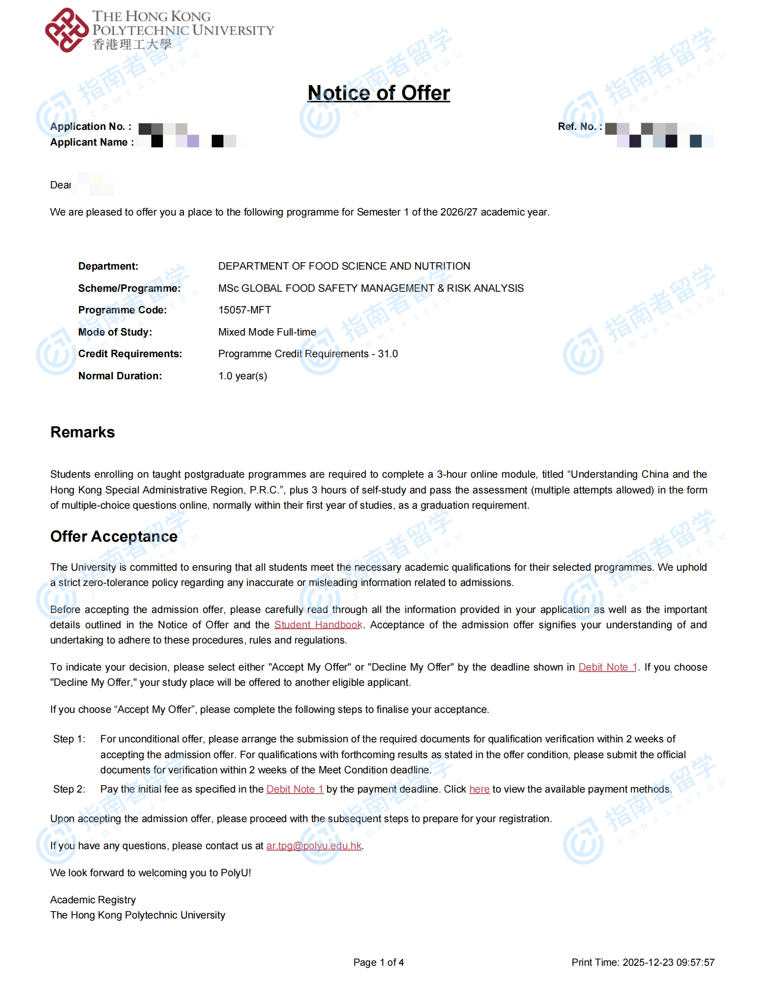 香港理工大學(xué)環(huán)球食品安全管理及風(fēng)險(xiǎn)分析理學(xué)碩士研究生offer一枚