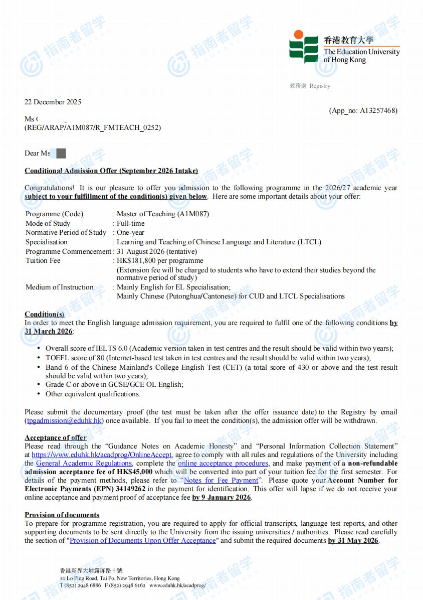 香港教育大學(xué)教學(xué)碩士研究生offer一枚