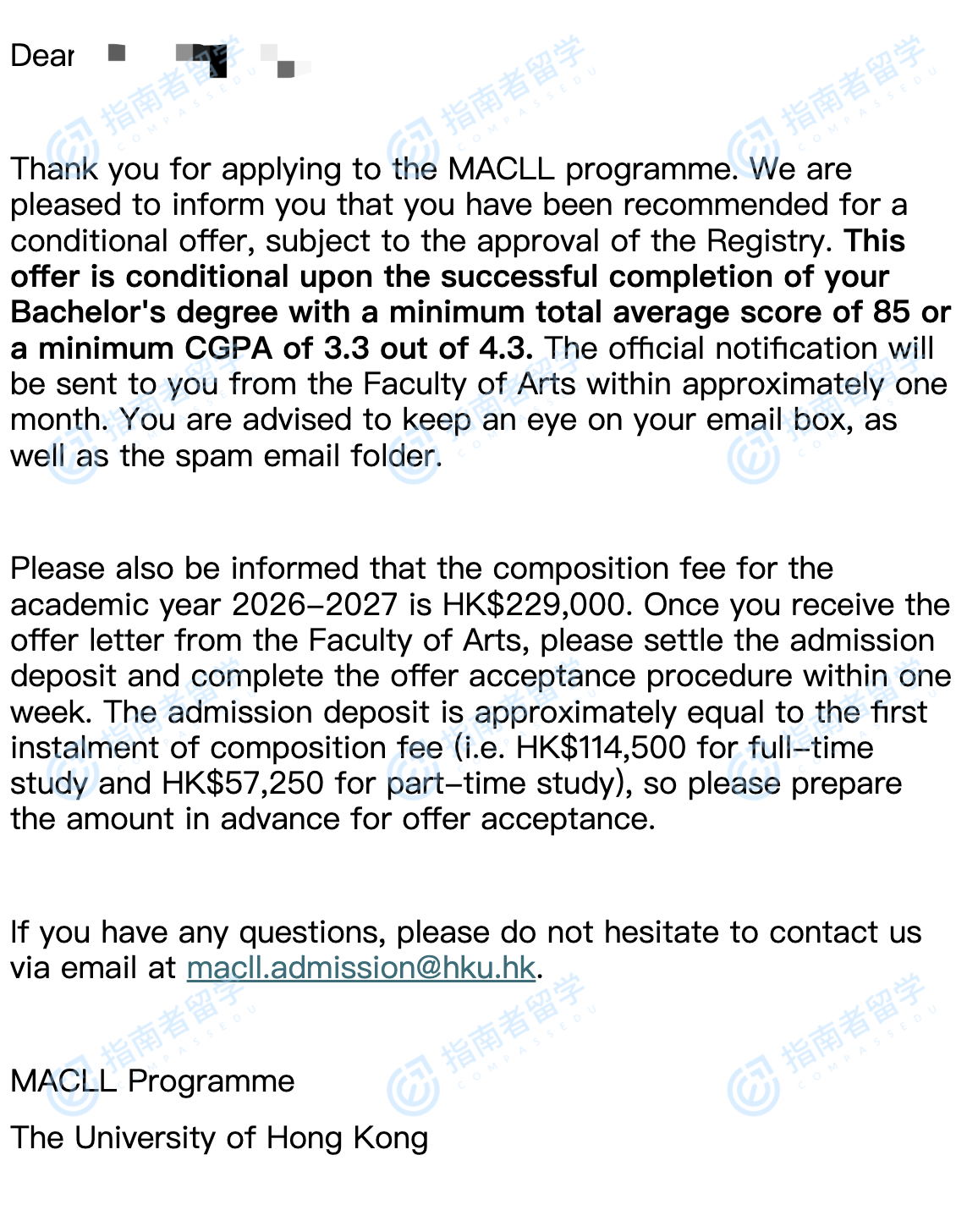 香港大學(xué)中國語言文學(xué)文學(xué)碩士研究生offer一枚