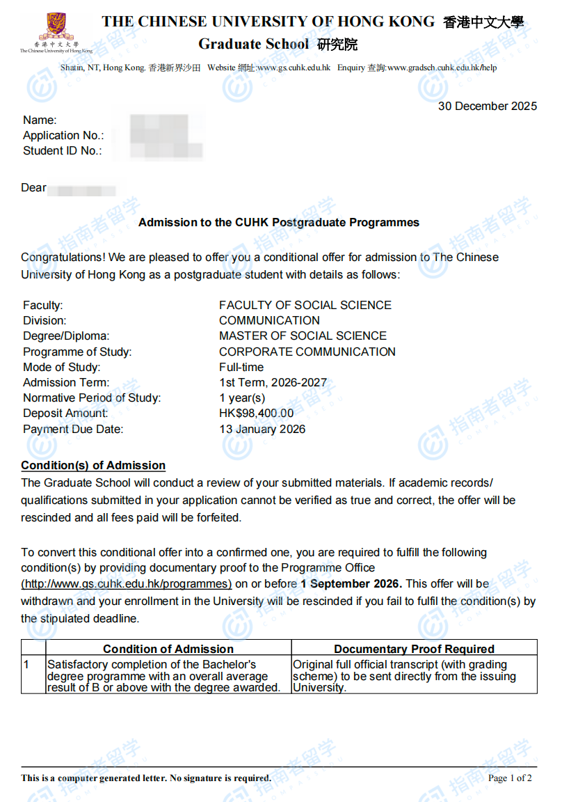 香港中文大學(xué)企業(yè)傳播社會科學(xué)碩士研究生offer一枚