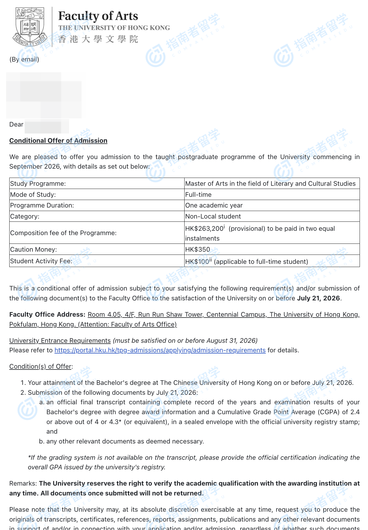 香港大學(xué)文學(xué)與文化研究文學(xué)碩士研究生offer一枚