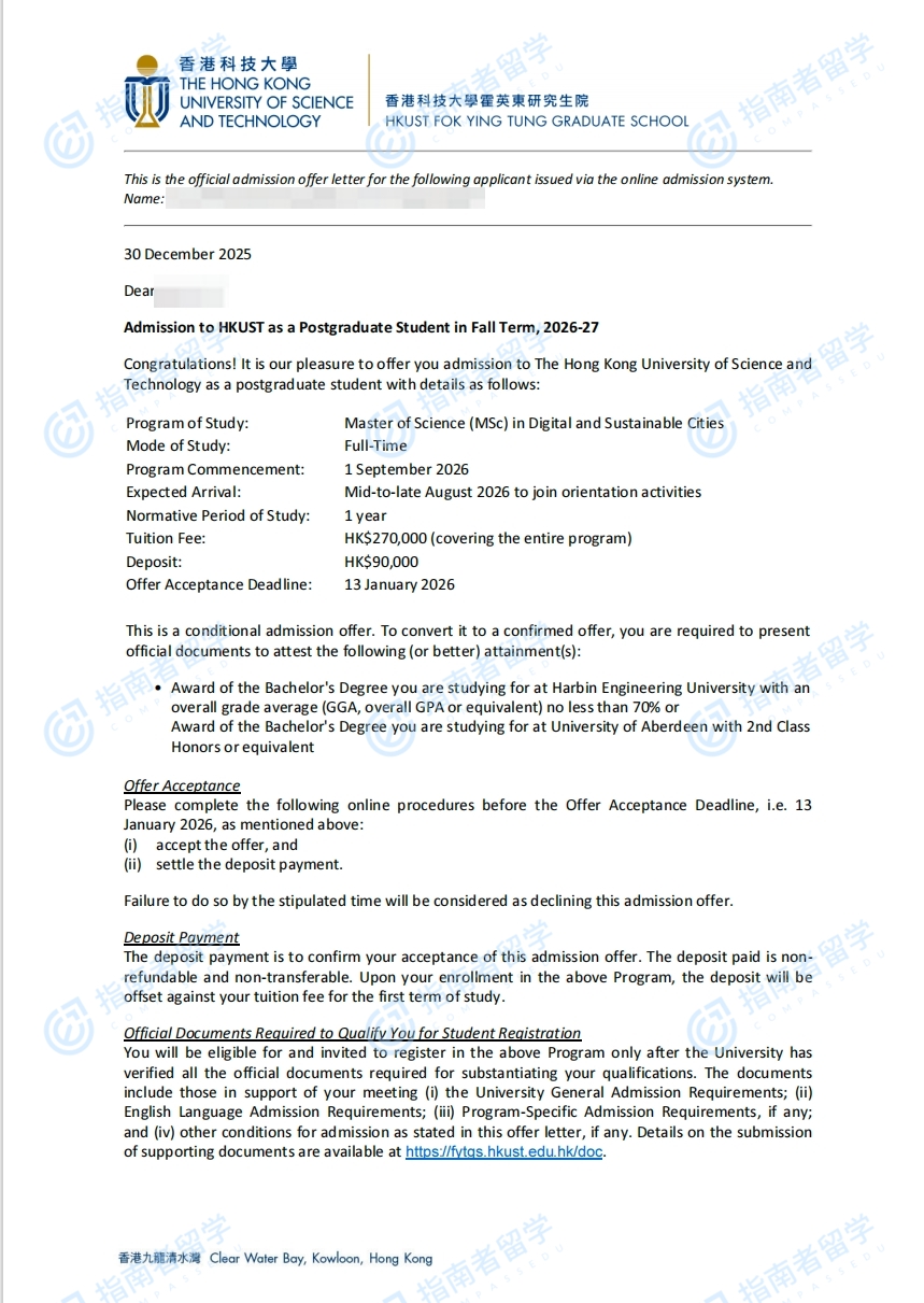 香港科技大學數(shù)字與可持續(xù)城市理學碩士研究生offer一枚