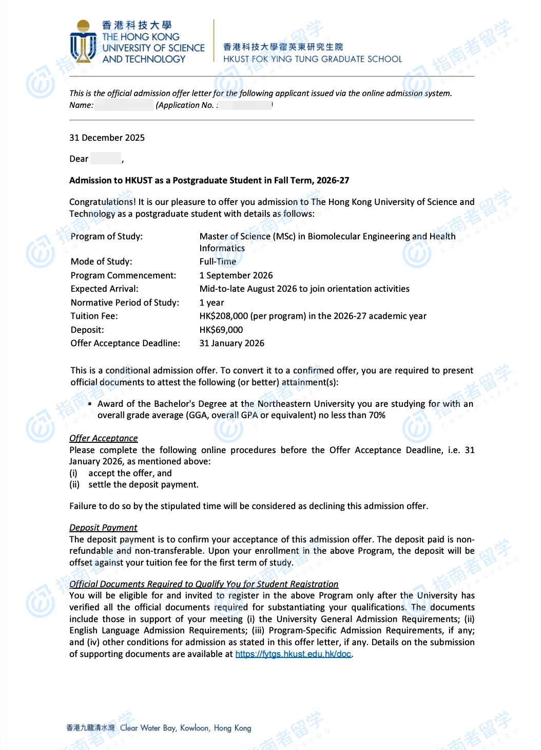 香港科技大學(xué)生物分子工程與健康信息學(xué)理學(xué)碩士研究生offer一枚