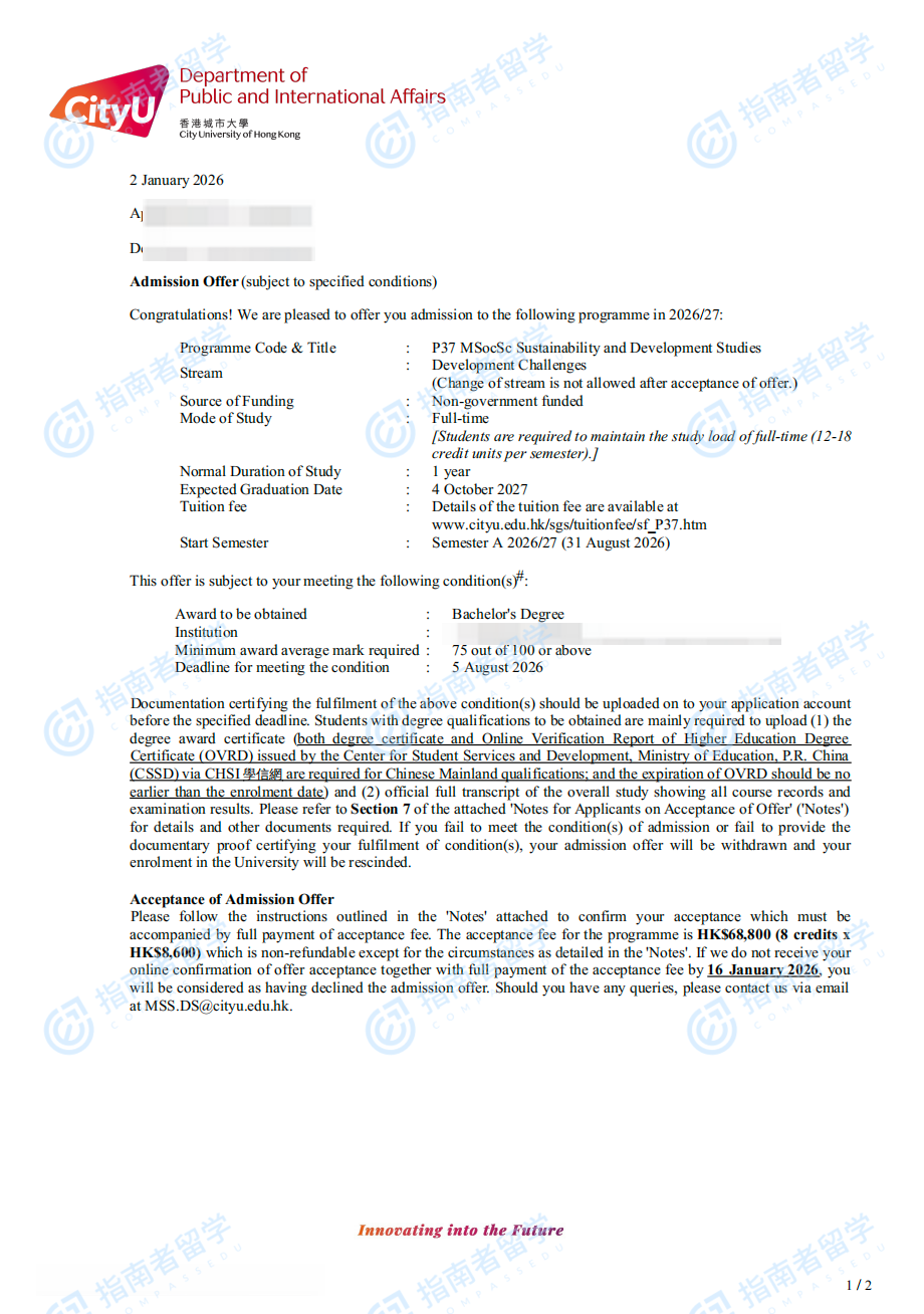 香港城市大學可持續(xù)與發(fā)展研究社會科學碩士研究生offer一枚
