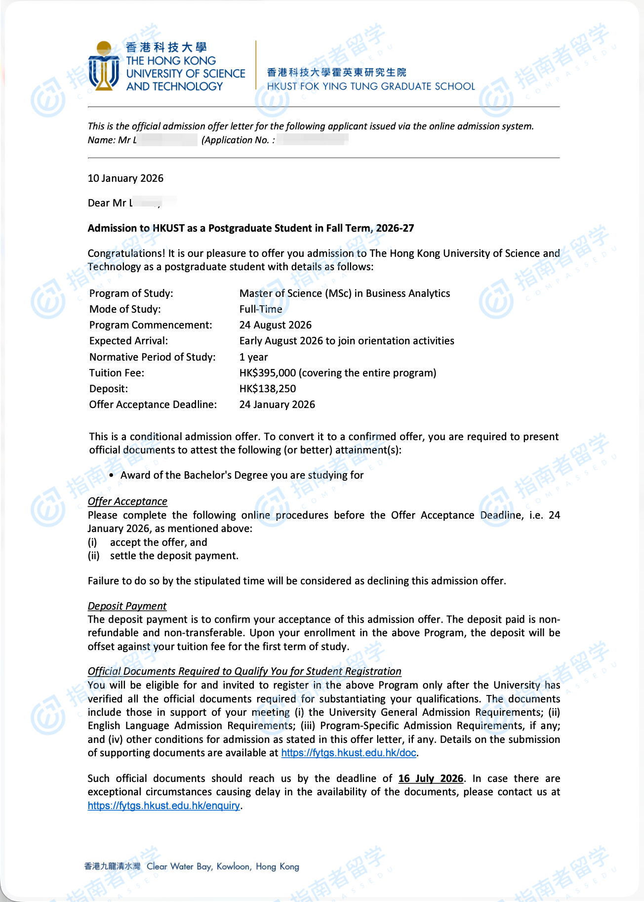 香港科技大學(xué)商業(yè)分析理學(xué)碩士研究生offer一枚