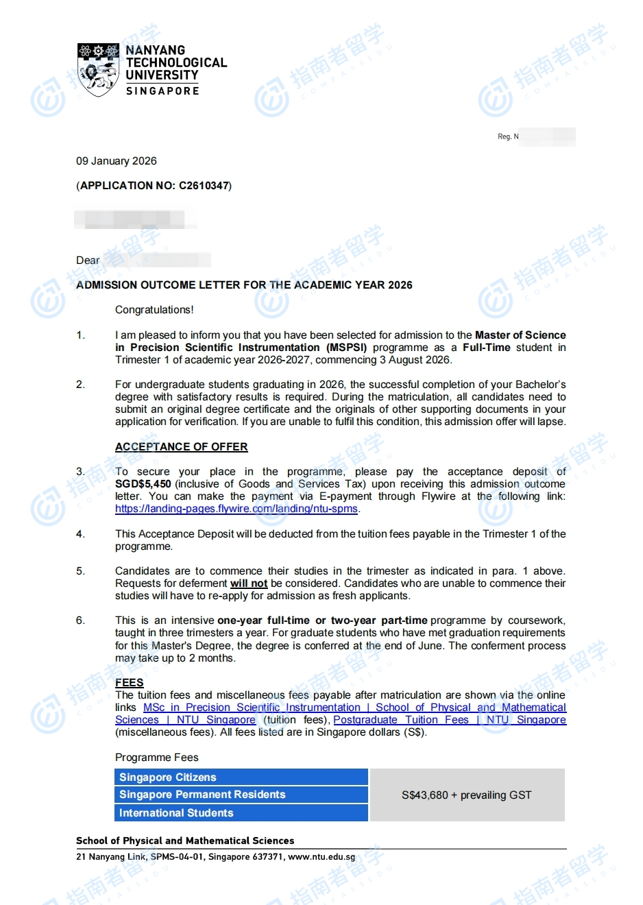 南洋理工大學(xué)精密科學(xué)儀器理學(xué)碩士研究生offer一枚