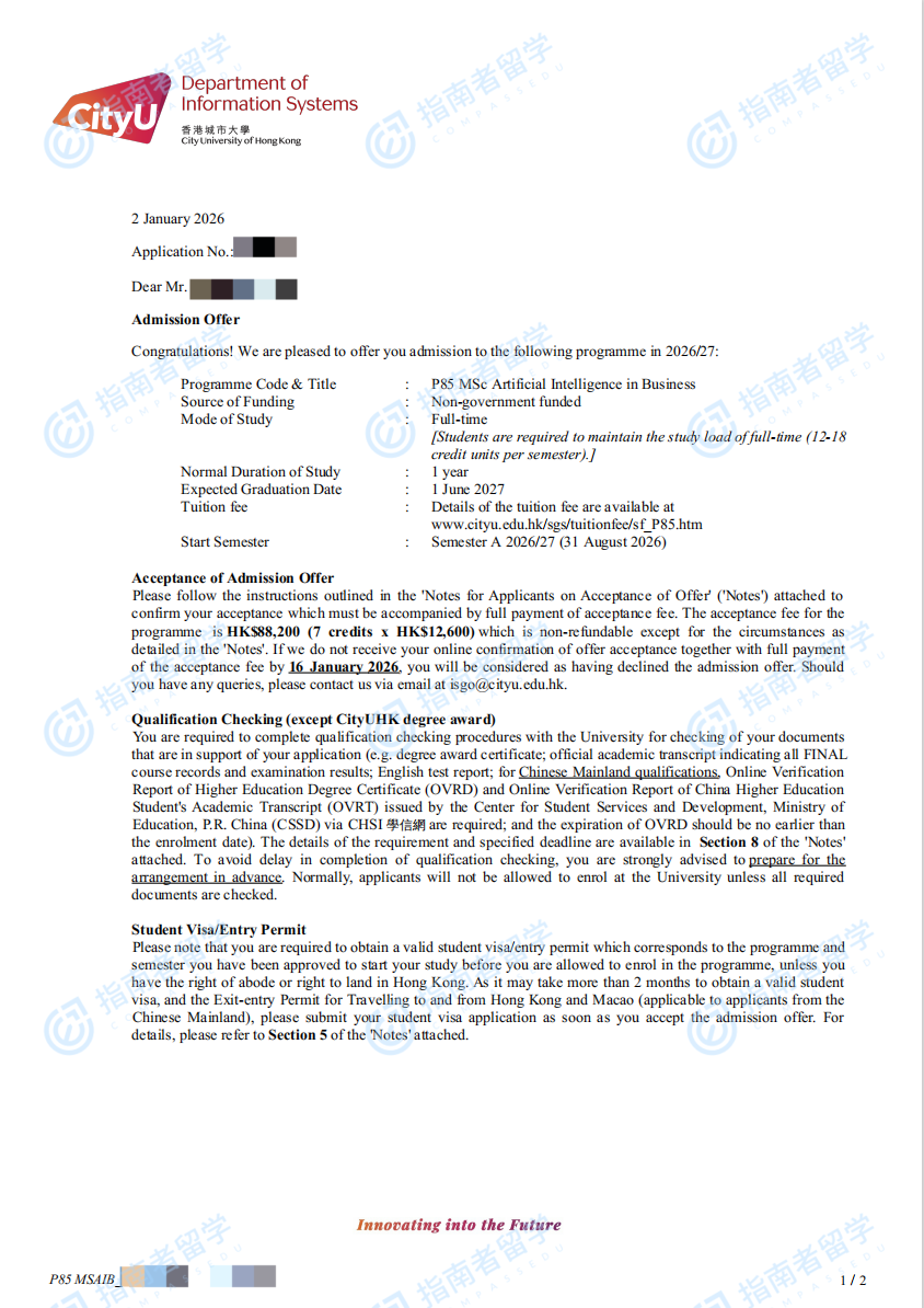香港城市大學(xué)商業(yè)人工智能理學(xué)碩士研究生offer一枚