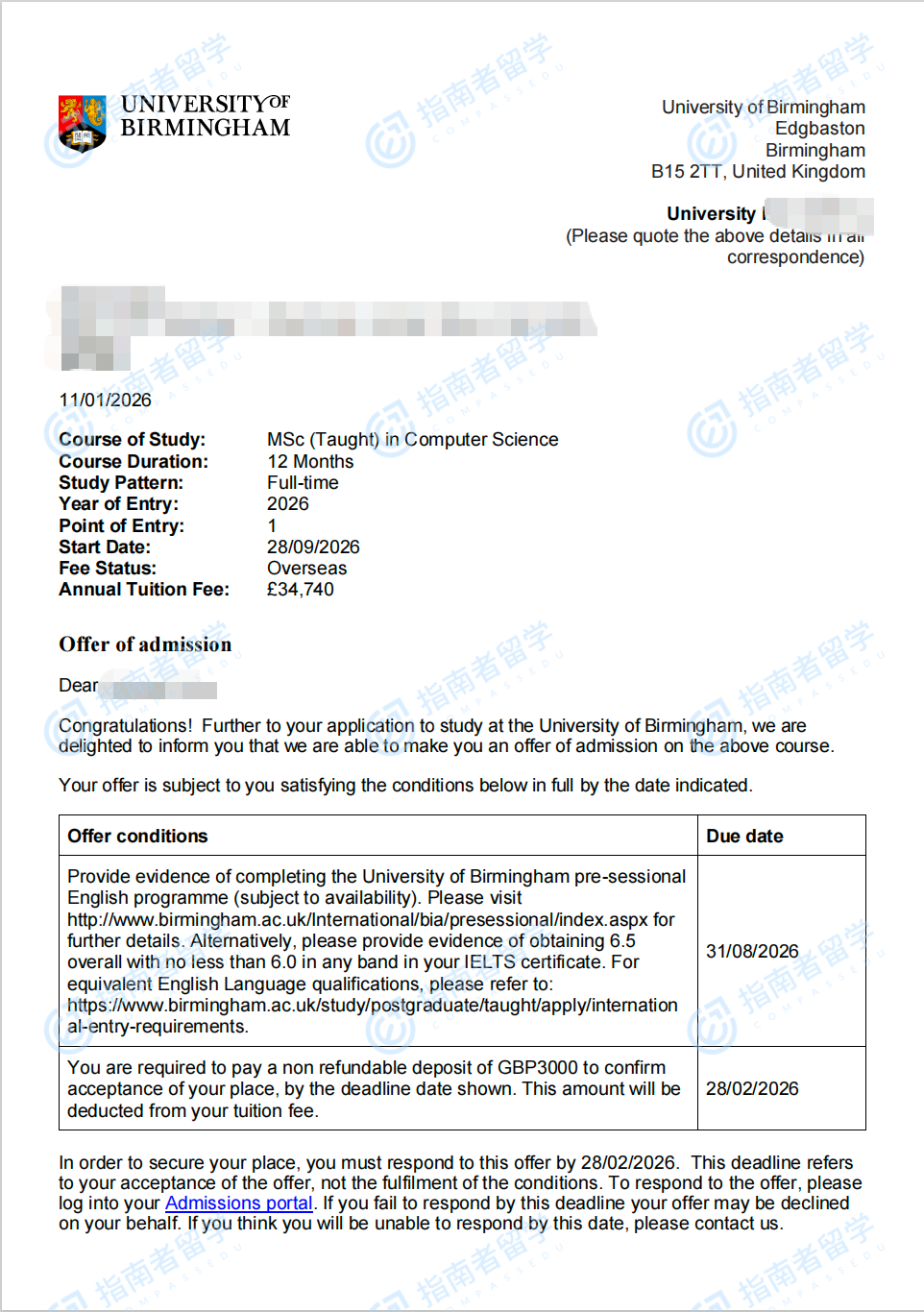 伯明翰大學(xué)計(jì)算機(jī)科學(xué)理學(xué)碩士研究生offer一枚