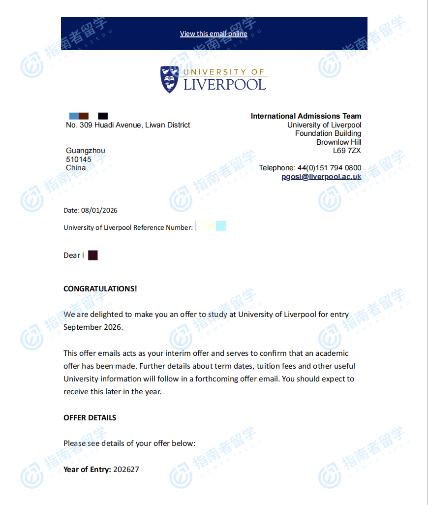 利茲大學(xué)生物醫(yī)藥開發(fā)理學(xué)碩士研究生offer一枚