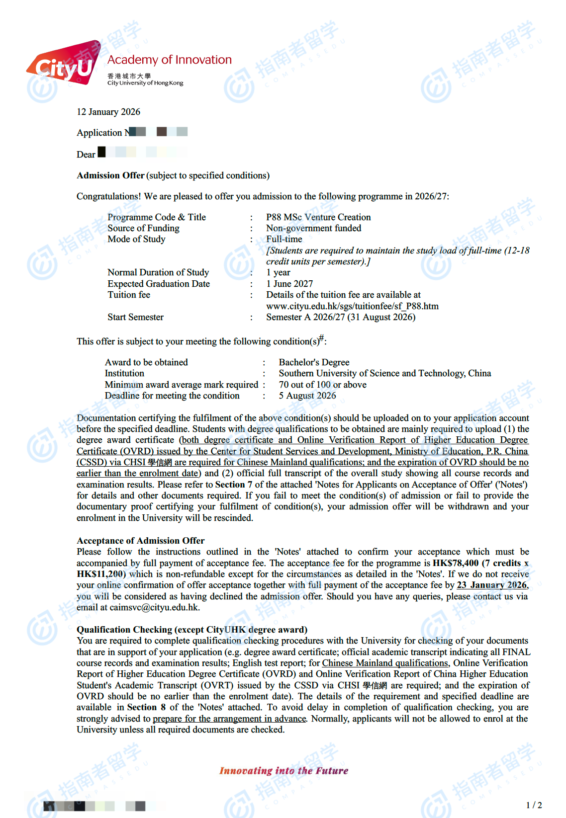 香港城市大學創(chuàng)新創(chuàng)業(yè)理學碩士研究生offer一枚