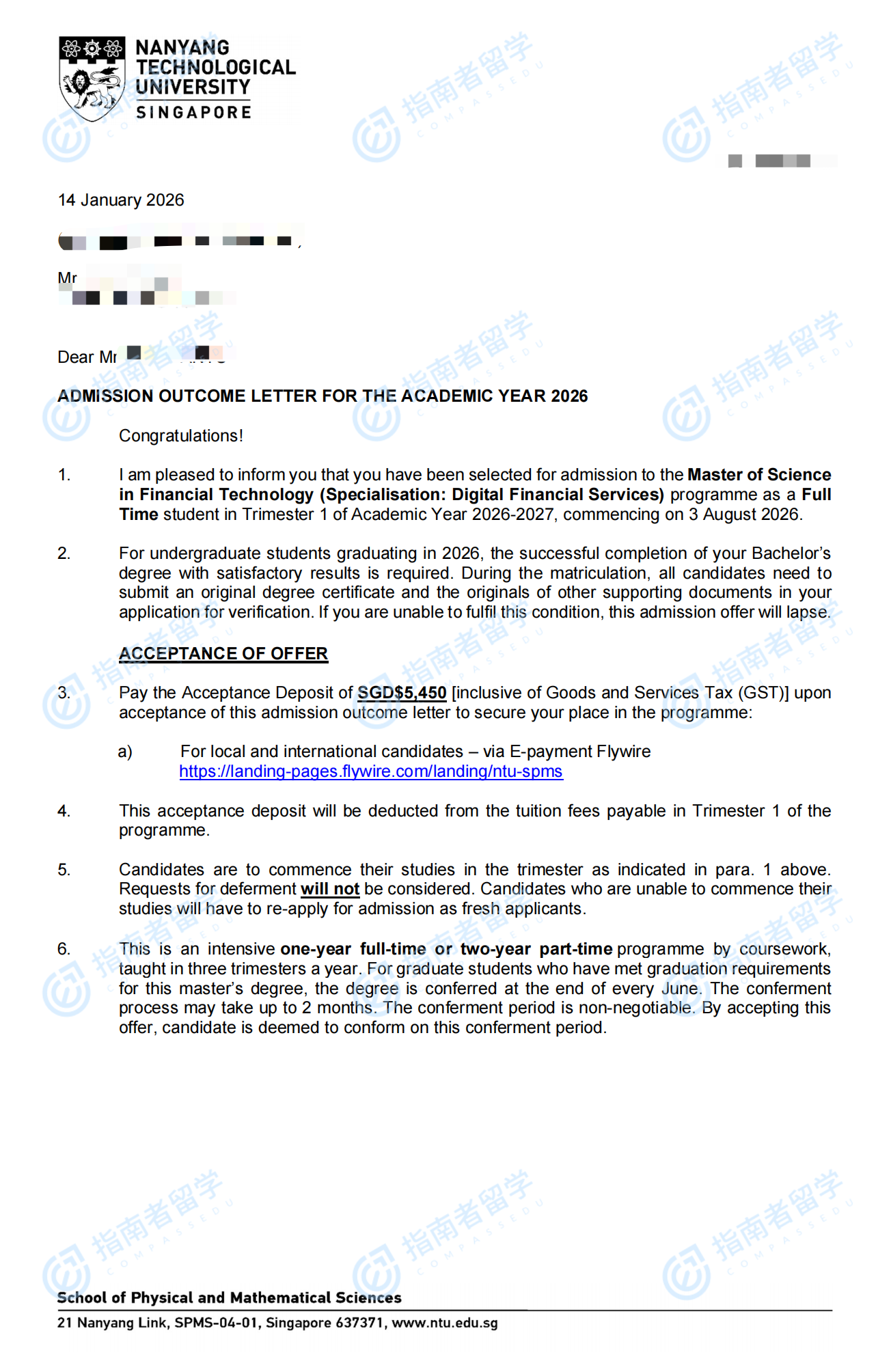 南洋理工大學(xué)金融科技理學(xué)碩士(數(shù)字金融服務(wù))研究生offer一枚