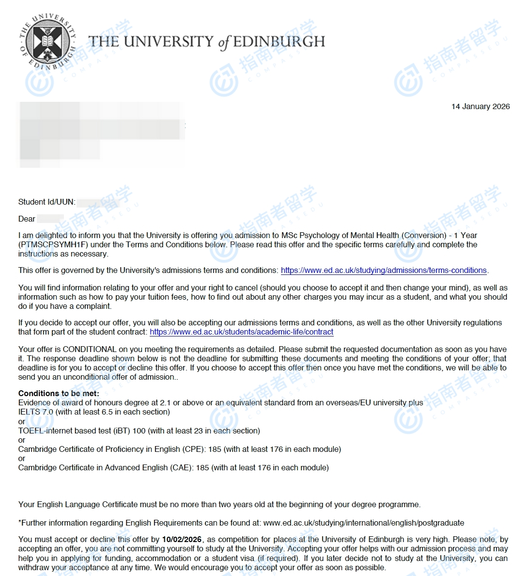 愛丁堡大學(xué)心理健康心理學(xué)理學(xué)碩士(可跨申)研究生offer一枚