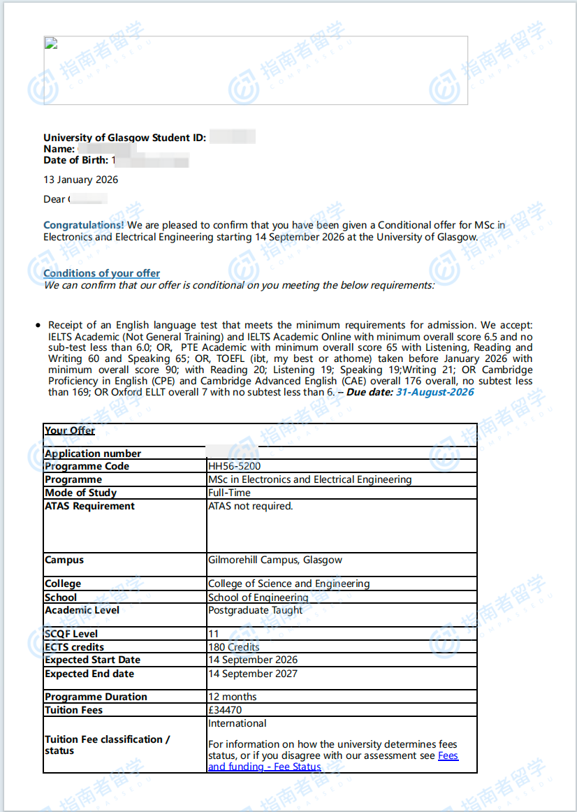 格拉斯哥大學(xué)電子與電氣工程理學(xué)碩士研究生offer一枚