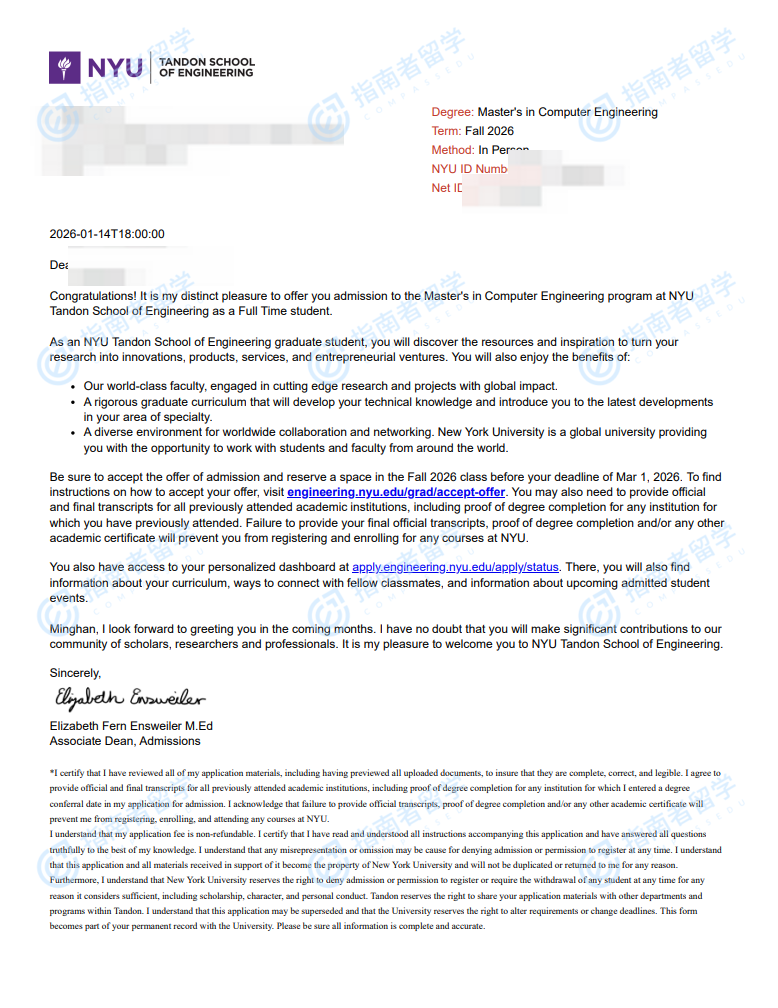 紐約大學(xué)計算機工程碩士研究生offer一枚