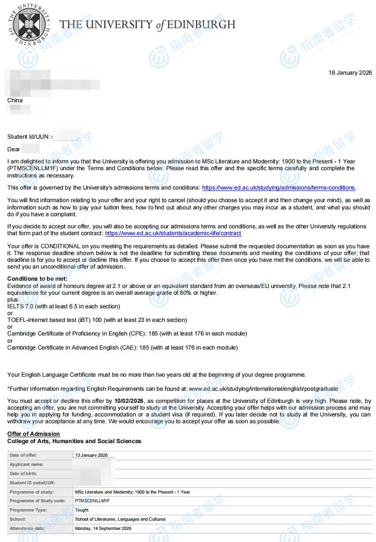 愛(ài)丁堡大學(xué)英語(yǔ)文學(xué)理學(xué)碩士(文學(xué)與現(xiàn)代性:1900年至今)研究生offer一枚