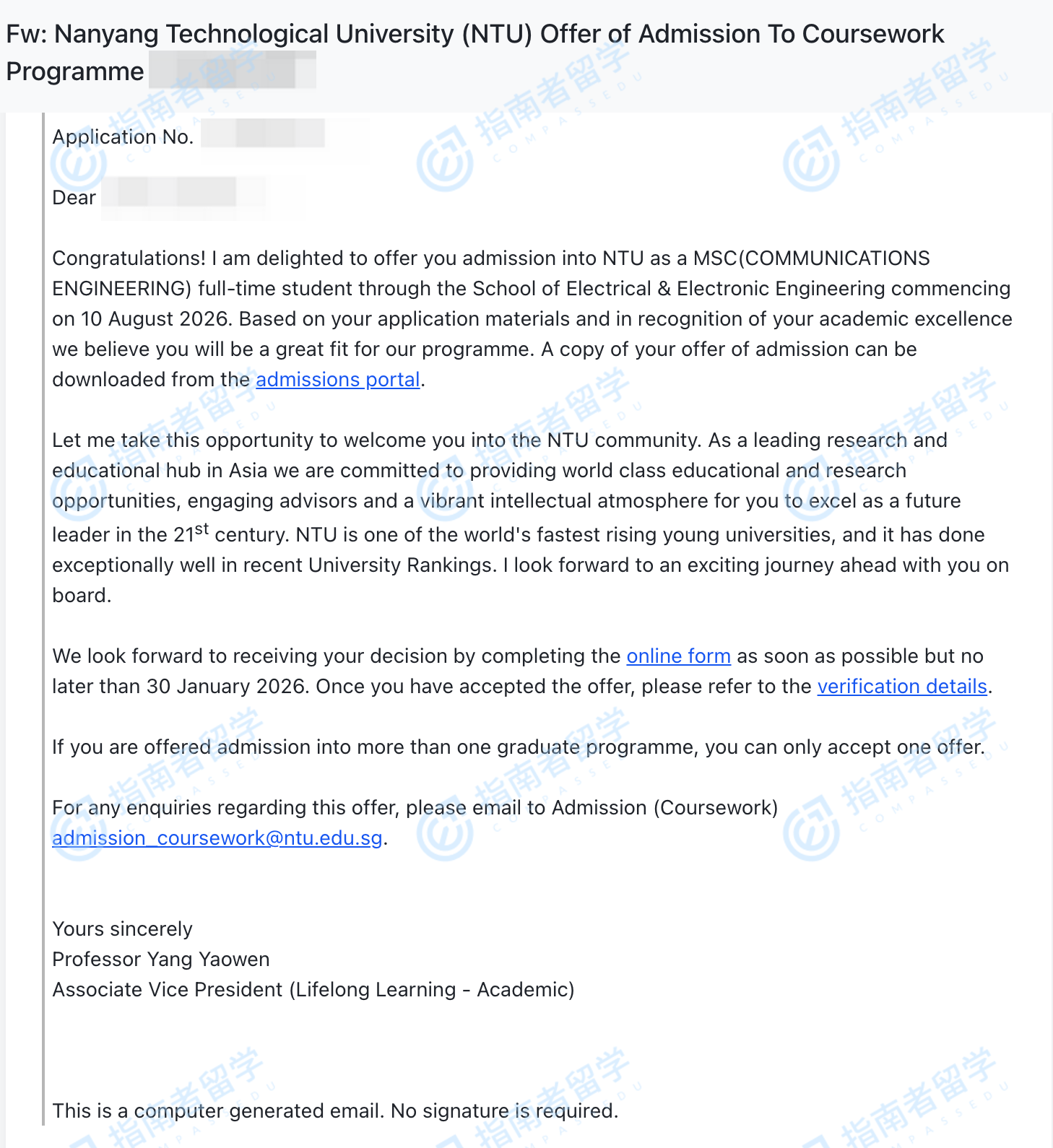 南洋理工大學(xué)通信工程理學(xué)碩士研究生offer一枚